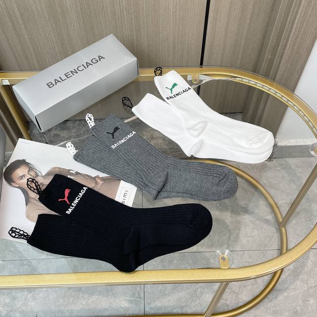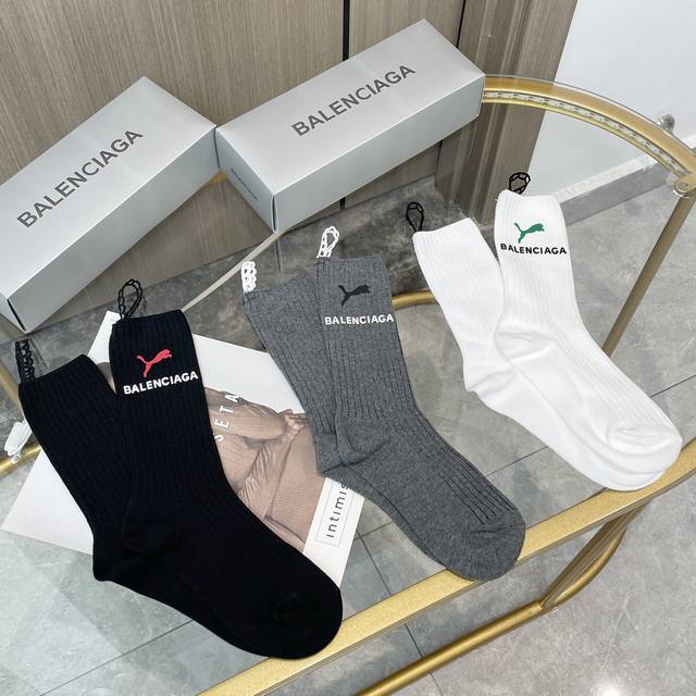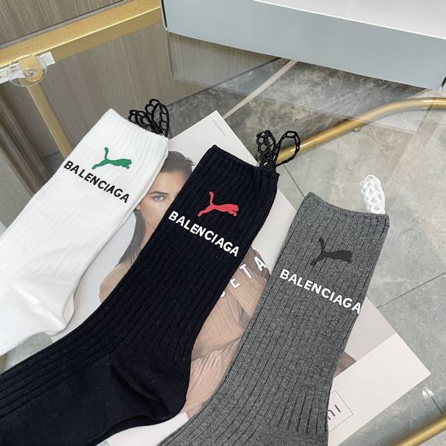 配包装 一盒三双 Balenciaga 巴黎世家 超级爆款网红袜子 巴黎家官网同步硅胶字母小腿袜,Ins明星网红推荐火爆至极纯棉材质,轻薄柔软透气,四季通用,欧