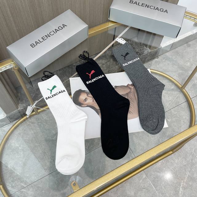 配包装 一盒三双 Balenciaga 巴黎世家 超级爆款网红袜子 巴黎家官网同步硅胶字母小腿袜,Ins明星网红推荐火爆至极纯棉材质,轻薄柔软透气,四季通用,欧美大牌街头必备