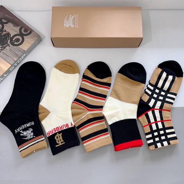 / 配包装 一盒5双 Burberry 巴宝莉经典字母Logo中筒袜子,个性时尚百搭款,!你值得拥有哦精梳棉面料,超柔软材质,舒适透气