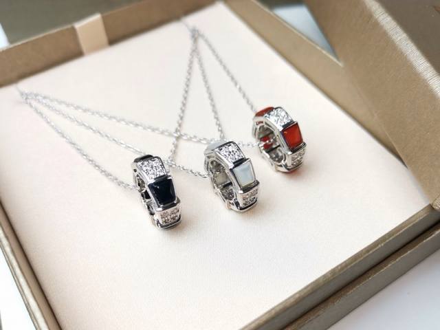 宝格丽Bvlgari 新款黑玛瑙 红玛瑙 白贝母间隔镶钻蛇骨吊坠项链 天然玛瑙 贝壳与钻相间 尽显格调原单打造 高端定制 亚金电镀18K玫瑰金白金宝家经典蛇纹造型搭配原版扣头 工艺精细