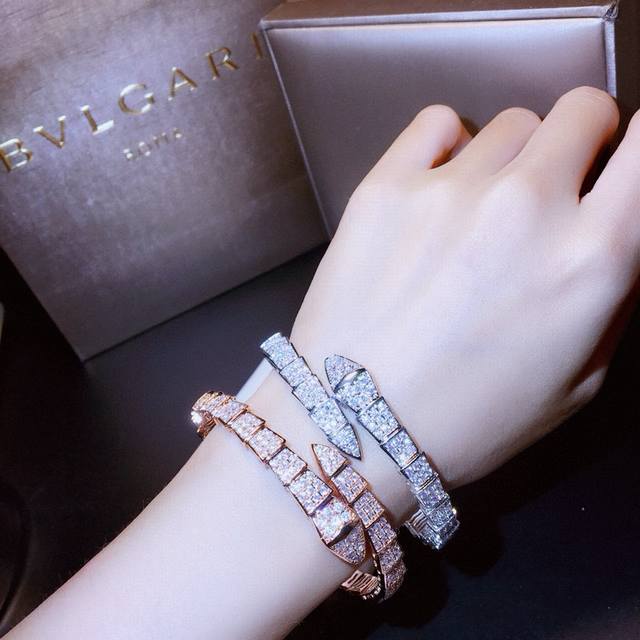 FFF Bvlgari宝格丽单圈蛇手镯。以令人沉醉的绝妙设计捕捉Serpenti手镯的魅力、诱惑和迷人的性感,以此向其灵兽致敬。此款手镯鳞片密镶钻石,梨形明亮式切割钻石尽显极致光芒,呈现灵蛇独有的蔓延弯曲,在手部蔓延萦绕,魅惑动人。 Serpenti高级珠宝手镯,亚金材质电镀18K白金色,玫瑰金色!P刻有Logo! DDD
