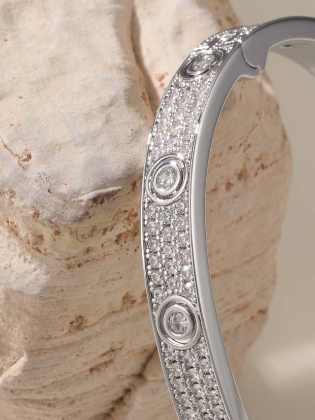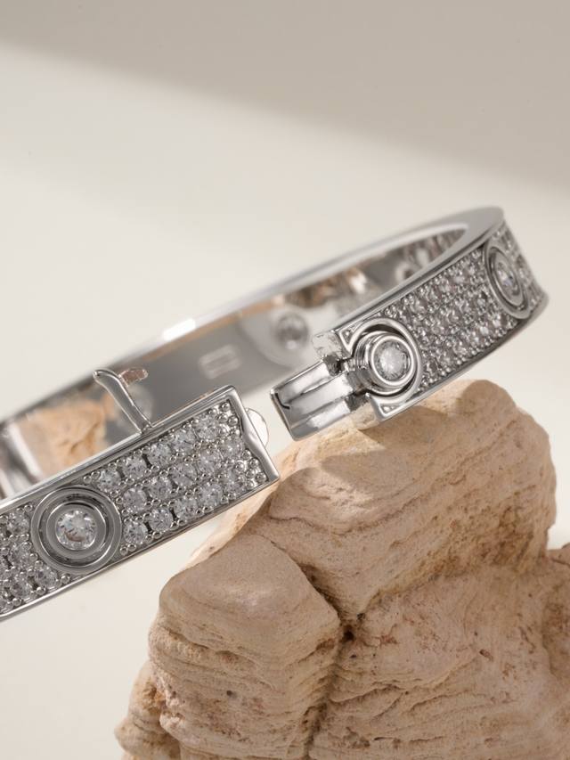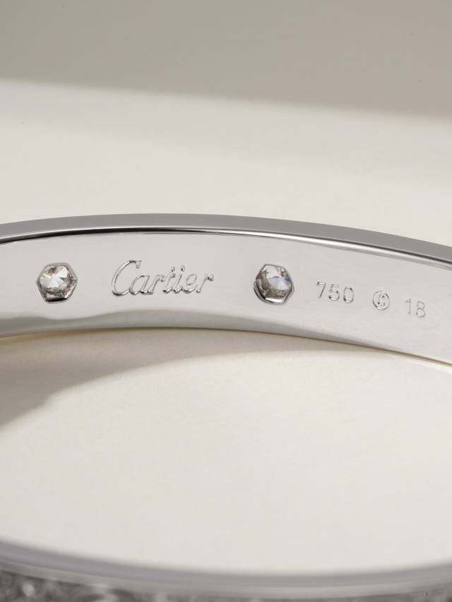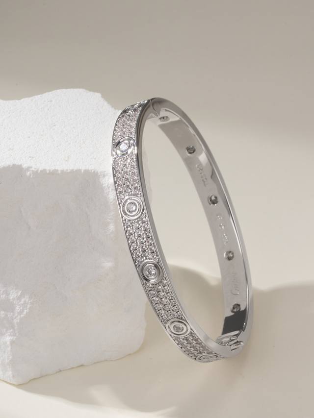 / 蜡镶版白金色 DDD 卡地亚经典宽式满天星Love手镯,蜡镶钻的效果正常外观没有多大区别,镶钻工艺为蜡镶钻 通过镶嵌在树脂蜡模上,一次性浇筑而成,比起手镶钻简单