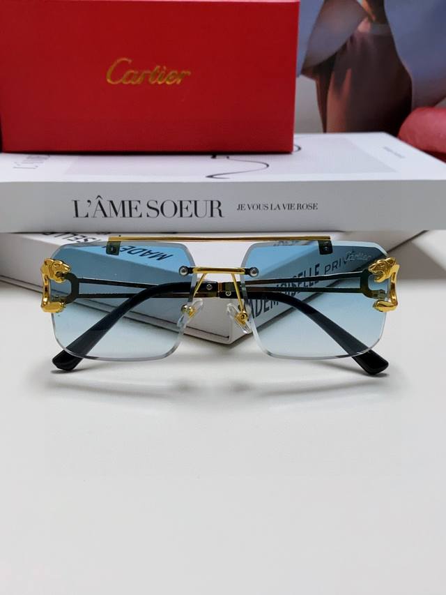 Cartier卡地亚 双梁切边无框太阳镜个性优雅男女皆可浮夸复古风豹子头装饰墨镜 DDD
