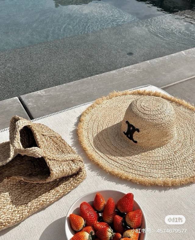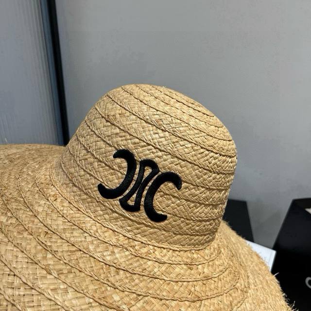 / Celine赛琳毛边拉菲草帽,官方款刺绣Logo,头围57Cm,旅游遮阳必备哦