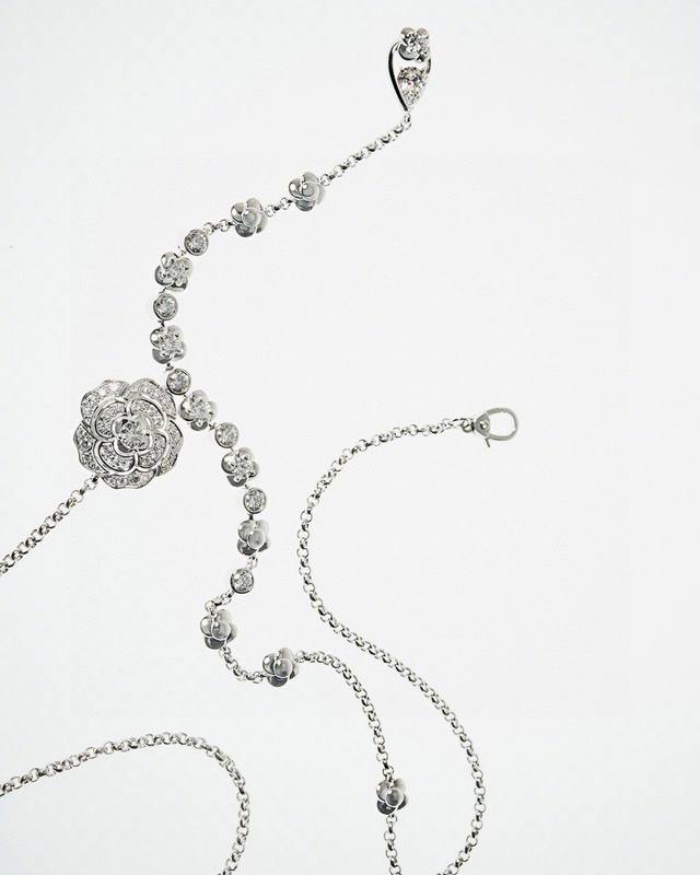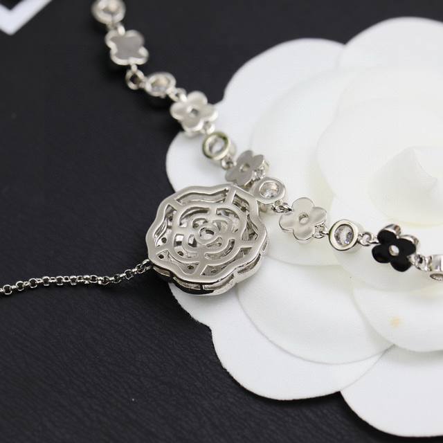 Chanel香奈儿镂空山茶花项链 经典热销款 香奈儿女神必备 Chanel镂空茶花项链满钻版 亚金材质 高版本 电镀18K白金 原版Logo 链长45Cm调节