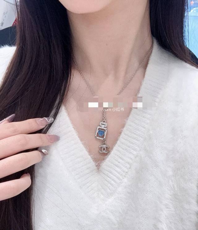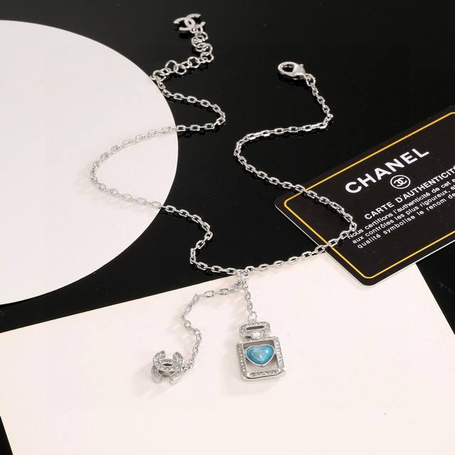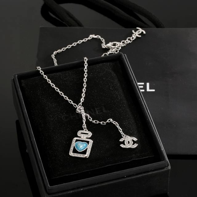 / Chanel 小香奈儿蓝色爱心香水瓶项链,高端品质,专柜同材质,做工精致细腻,重工版本,简约大方温文尔雅,特别温柔。经典双C上点缀着施华洛世奇水钻,Blingb