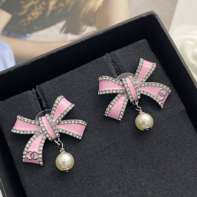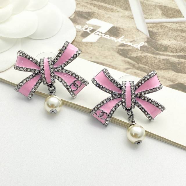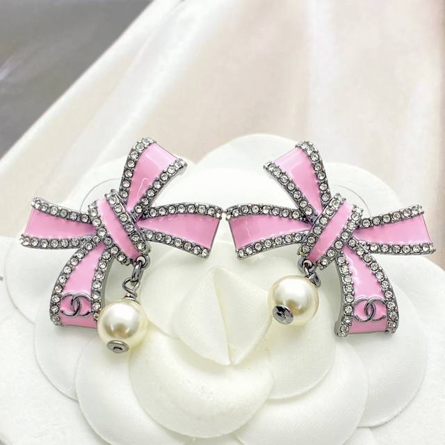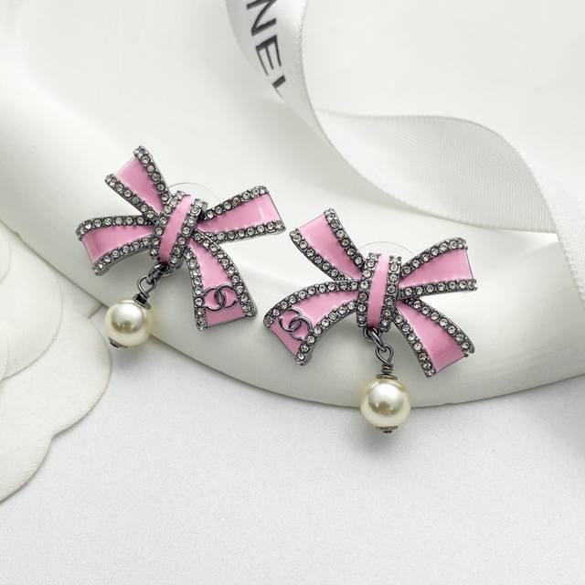 / 今日新款 编码E3174 0257820 香奈儿耳钉热销爆上新 Chan 25 黑粉色蝴蝶结珍珠耳钉 珐琅蝴蝶结小珍珠吊坠,粉釉立体造型非常有质感! 尾部枪色小