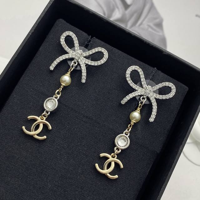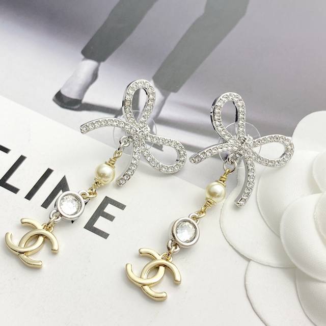 / 今日新款 编码E3209 0257820 香奈儿耳钉热销爆上新 Chan 25 银色水钻蝴蝶结流苏耳环 清冷银色满钻镂空蝴蝶结搭配珠钻流苏吊坠浅金小双C 金银拼