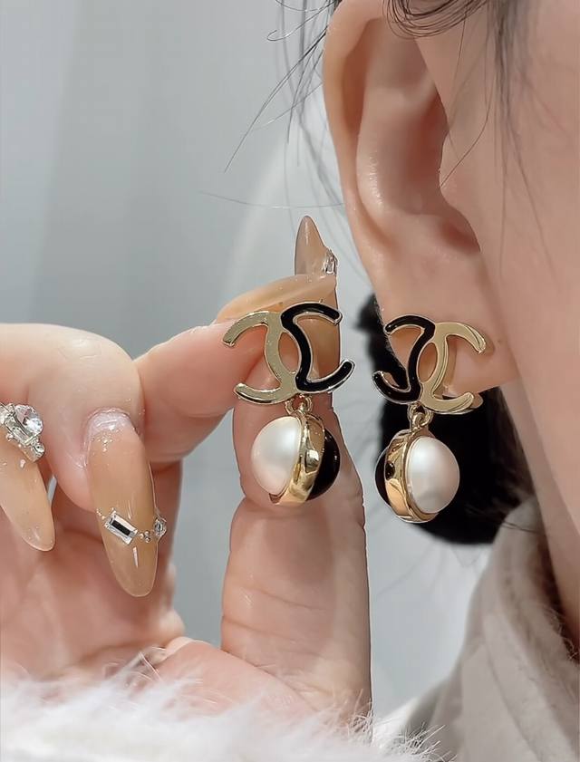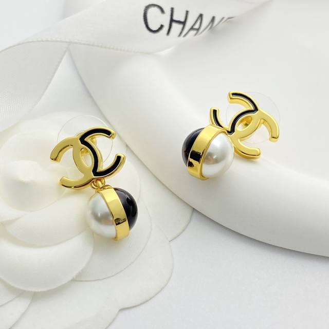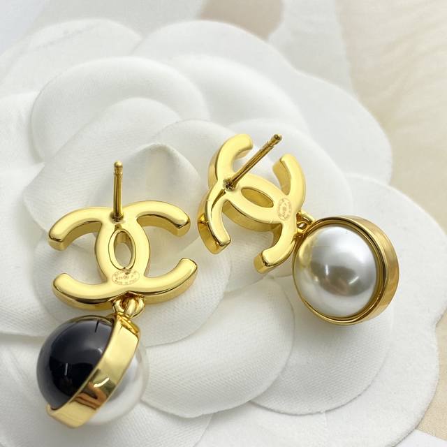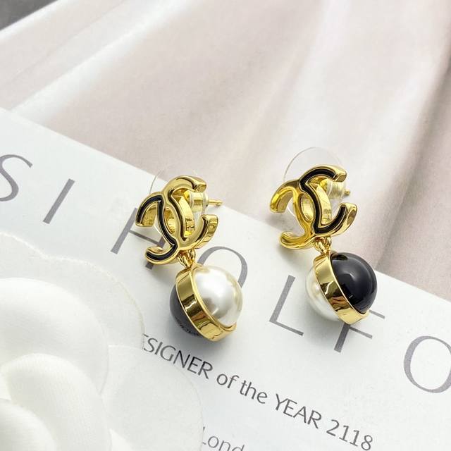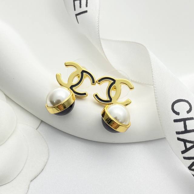 / 今日新款 编码E3322 0247825 香奈儿耳钉热销爆上新 Chan 25 黑金双C吊坠黑白双色珍珠球耳钉 半黑珐琅半金属双C吊坠黑白珍珠豆 黑色珐琅X金色