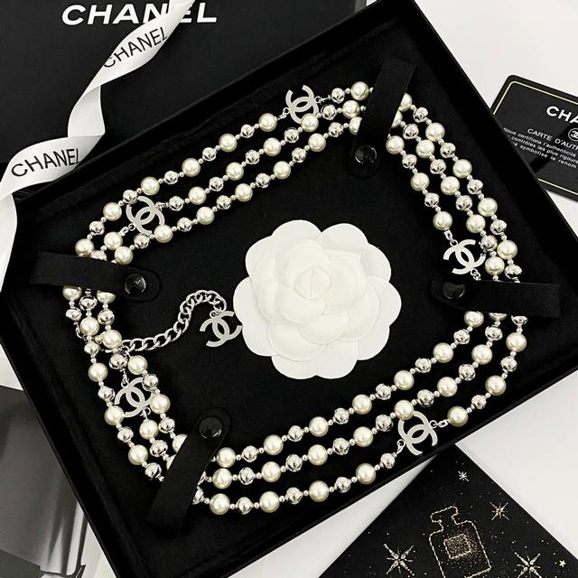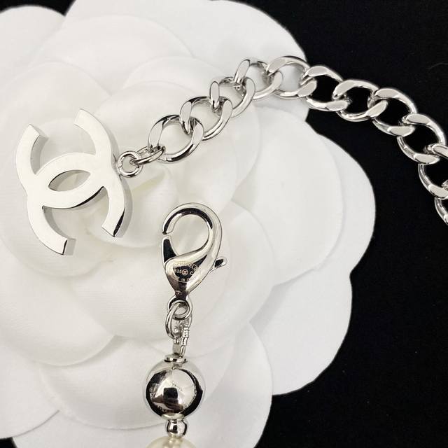 银白珍珠双色项链设计,搭配五个银色光面双C Logo