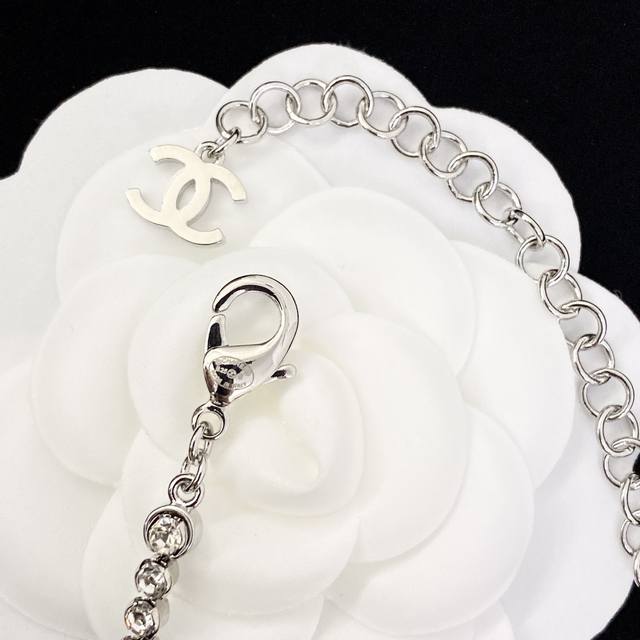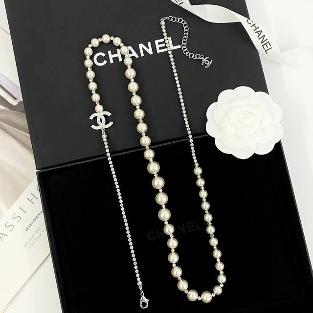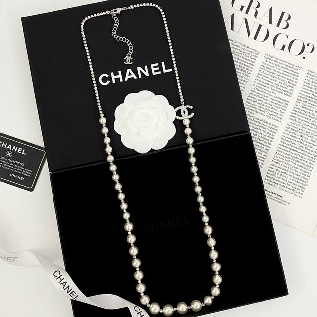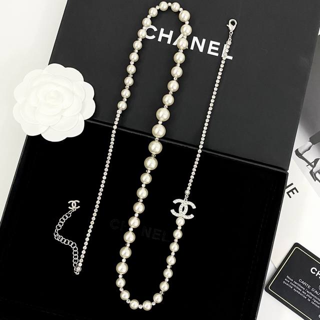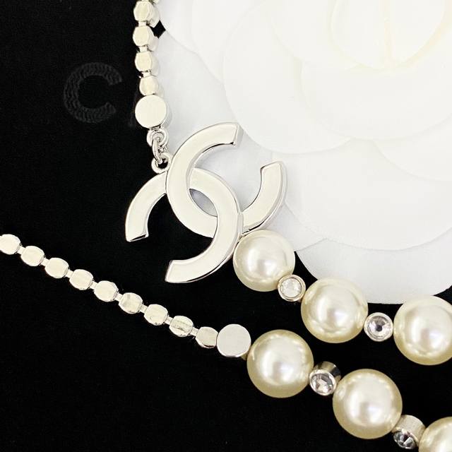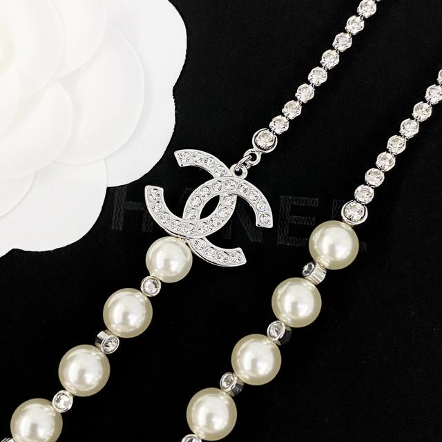 香奈儿项链热销爆上新 Chan 25 银色水晶拼接珍珠双C毛衣链 珍珠和水钻的拼接搭配很高级很贵气!渐变大小珍珠之间隔着水晶搭配满钻双C 整体Bling Bli