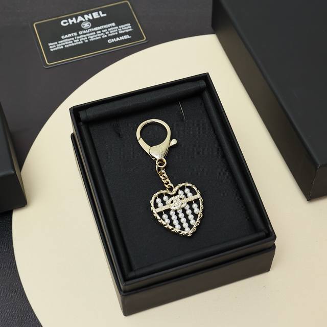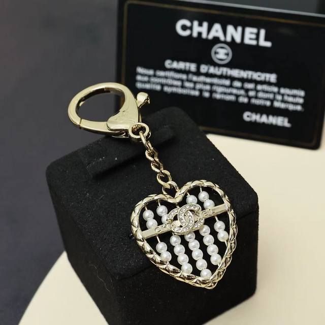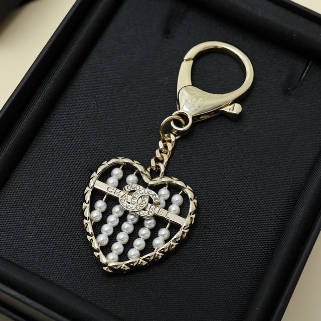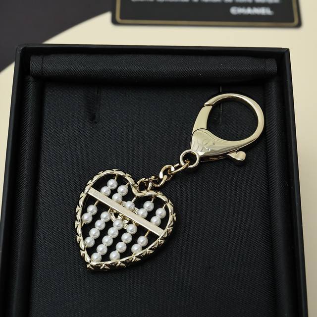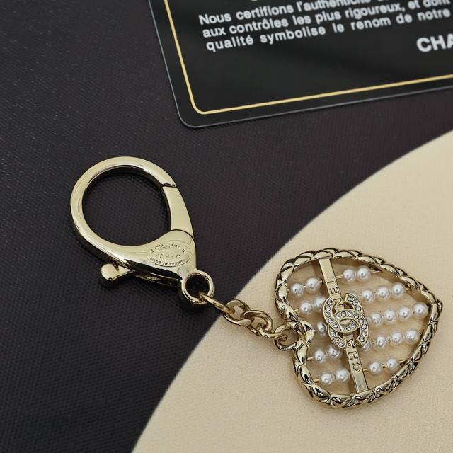 Chanel 25A新款金色满钻双C爱心珍珠算盘钥匙扣