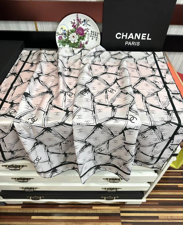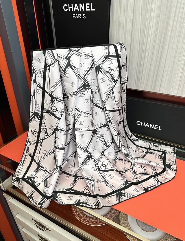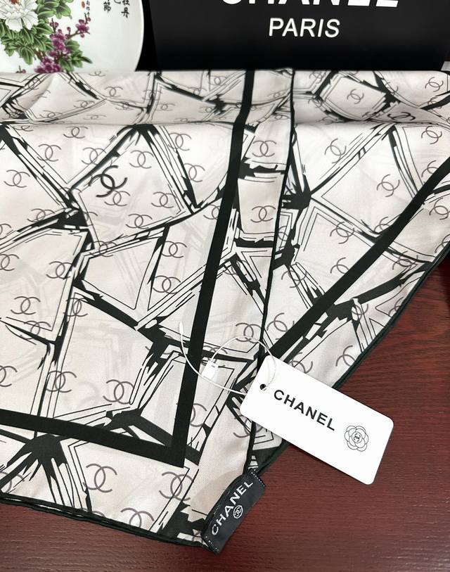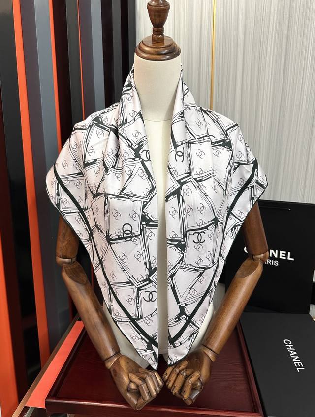 新款香奈儿 官网同步 精致手工卷边 极具品牌特色的涂鸦签名暗纹提花+简洁的Coco字母元素印花 大幅菱格点缀[嘴唇]配色复古高级 体现优雅风范的点睛之笔 无论流行什么色 经典黑白色永远走在时尚尖端怎么搭配都好看 尺寸:90X90 ,材质:真丝
