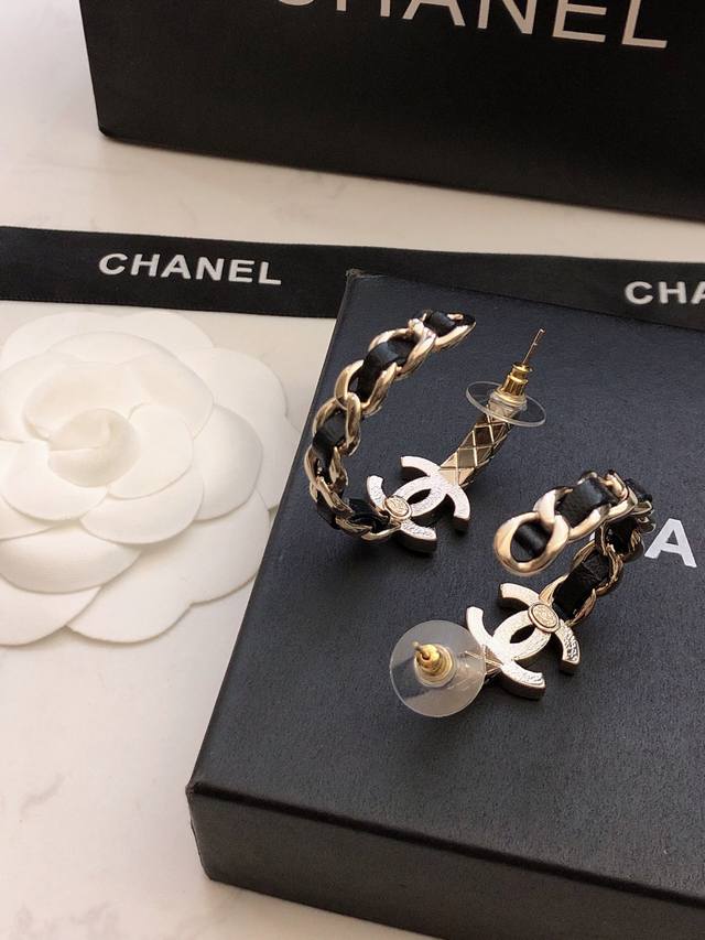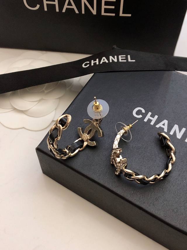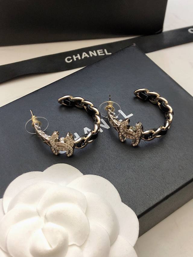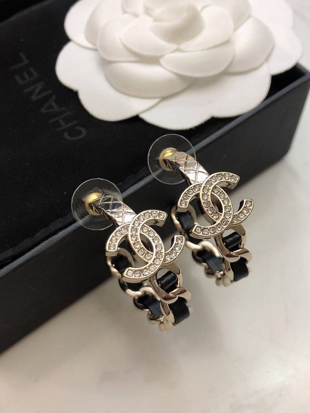 Chan 23 小香穿皮菱格纹水钻Cc大耳圈耳环