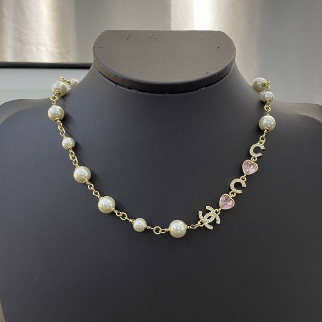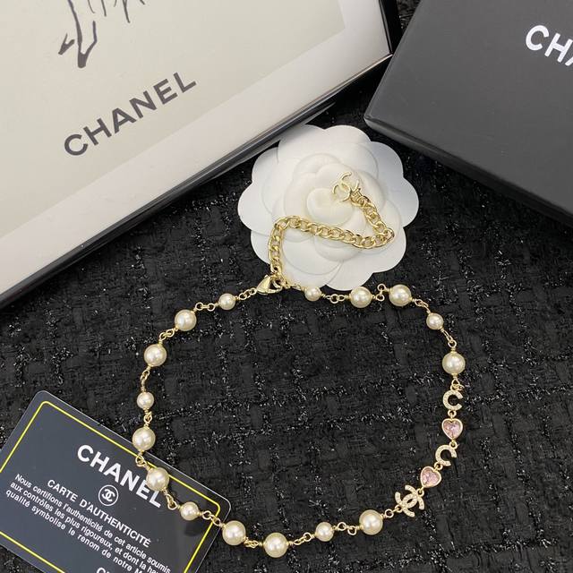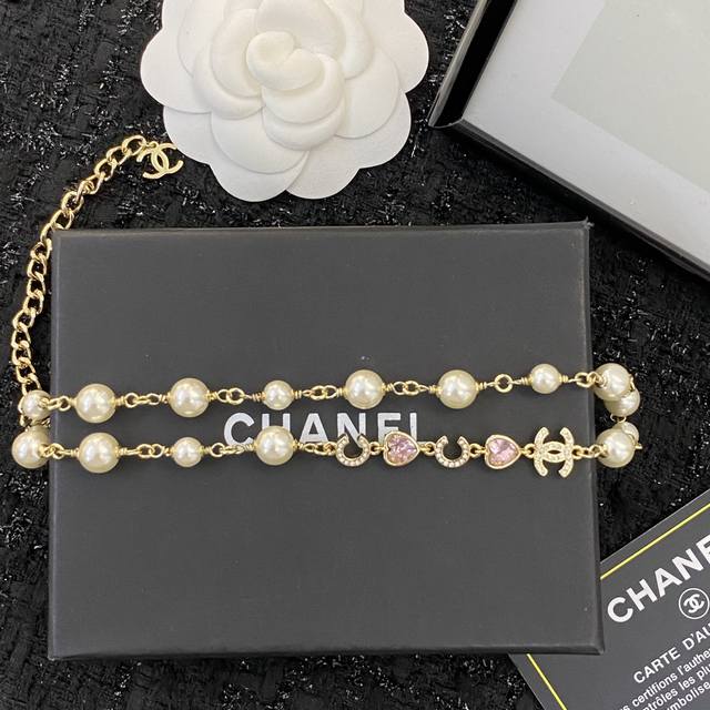 / 香奈儿项链热销款爆上新 Chanel 粉色爱心字母珍珠Chocker项链 粉嫩树脂珠爱心项链,简直是颜值狙击~ 夏天颈间一抹亮色,回头率暴涨! 气质温柔,甜妹必
