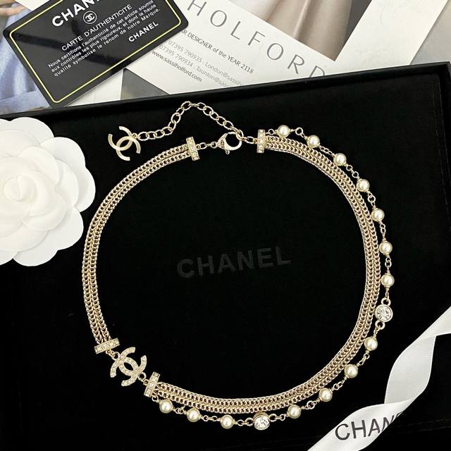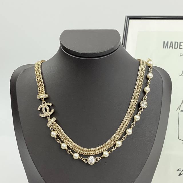 / 香奈儿项链热销爆上新 Chan 24 满钻双C金属编绳链条珍珠多层项链 编织纹路双链条珍珠水钻链条的设计 三链设计上身自带叠戴即视感 风格甜美精致且富有美感!无