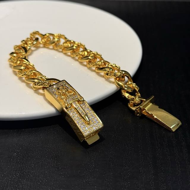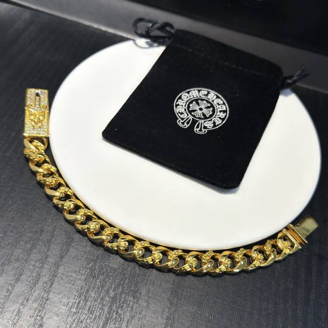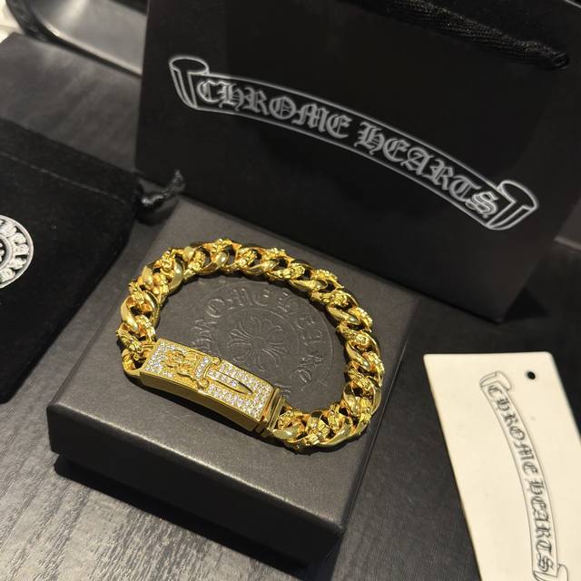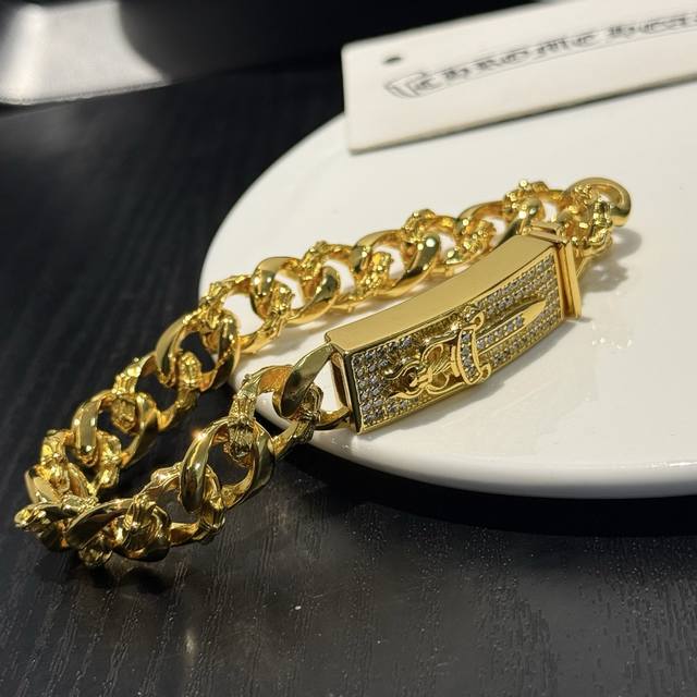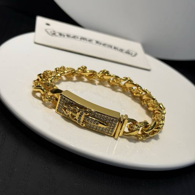 / 专柜品质Chrome Hearts克罗心黄金色经典半花十字花满钻宝剑手链,凹凸造型不同的花纹设计风格 呈现出与众不同 十字架 童军花是克罗心的志 所以更经久不衰