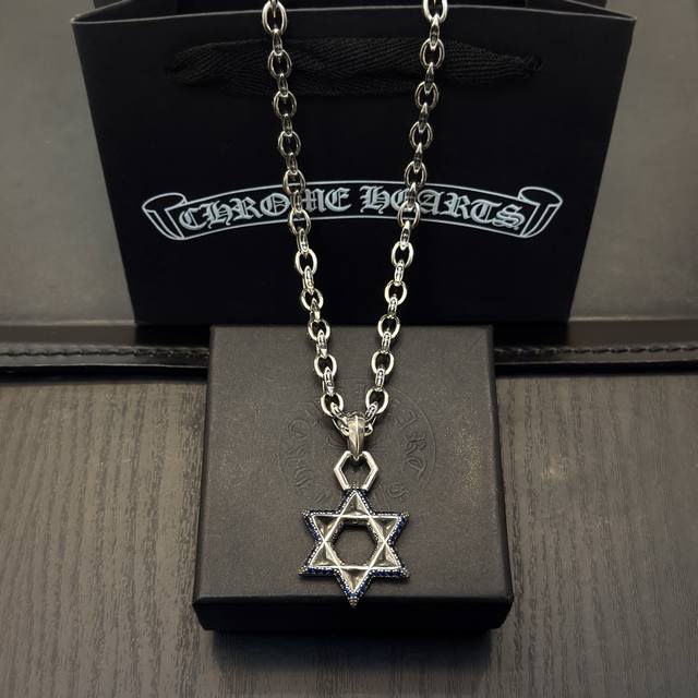 新款 专柜品质 Chrome Hearts克罗复古十字架项链 蓝钻六芒星吊坠 凹凸造型不同的花纹设计风格 呈现出与众不同 十字架 童军花是克罗心的志 所以更经久