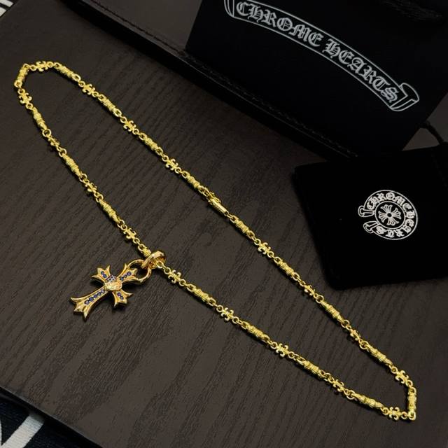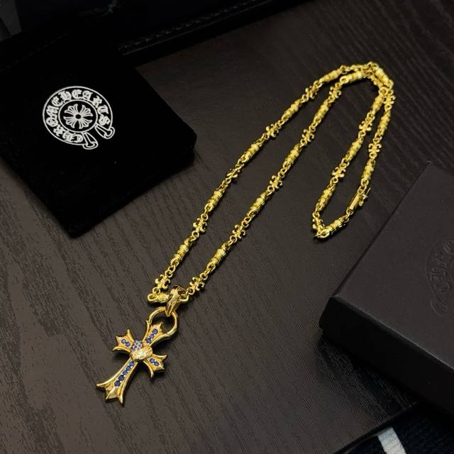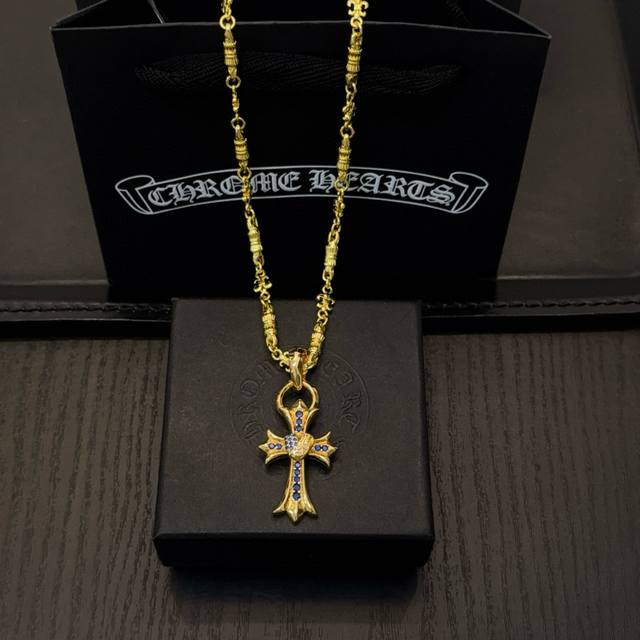 / 新款 专柜品质 Chrome Hearts克罗心黄金色字母项链 蓝钻藤蔓爱心十字架吊坠 凹凸造型不同的花纹设计风格 呈现出与众不同 十字架 童军花是克罗心的志