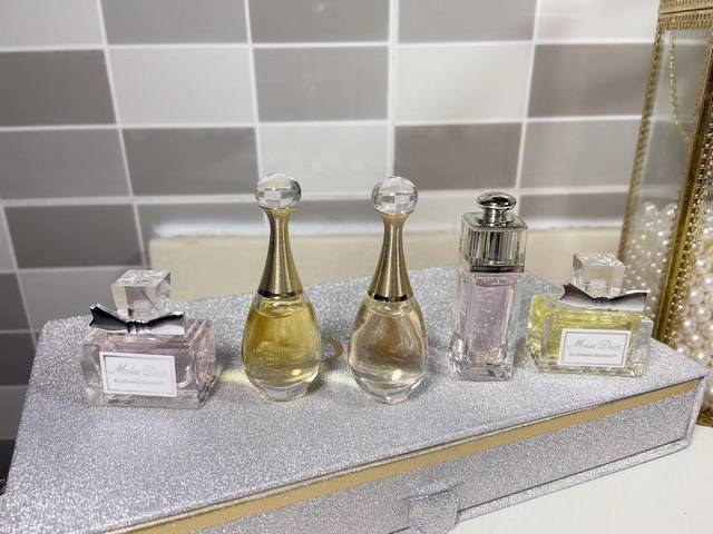 专柜品质迪奥五件套银盒香水5件套银盒,Q版喷头,分别为:淡香真我,黄甜心,粉甜心,粉魅惑,浓香真我、Dior迪奥银盒Q版香水小样5件套 全部都是热门款5Ml 旅行装,每一种都有自己的风格 携带方便轻巧 一次拥有五种味道