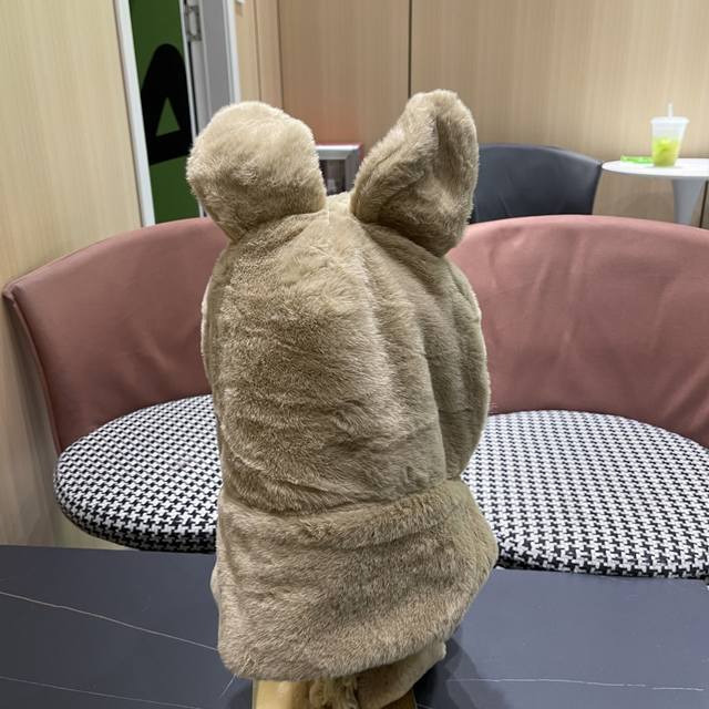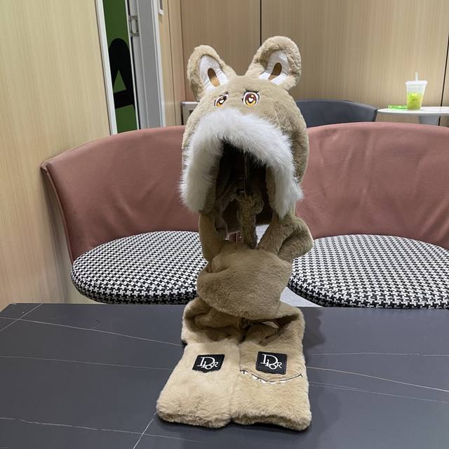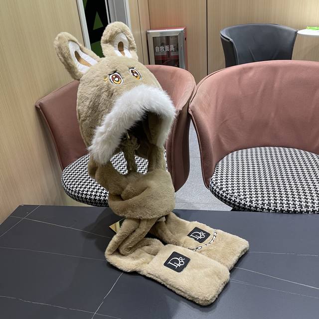 迪奥Dior冬季毛绒加厚帽子围巾手套三件套保暖蓄温 可爱小兔子围脖连帽