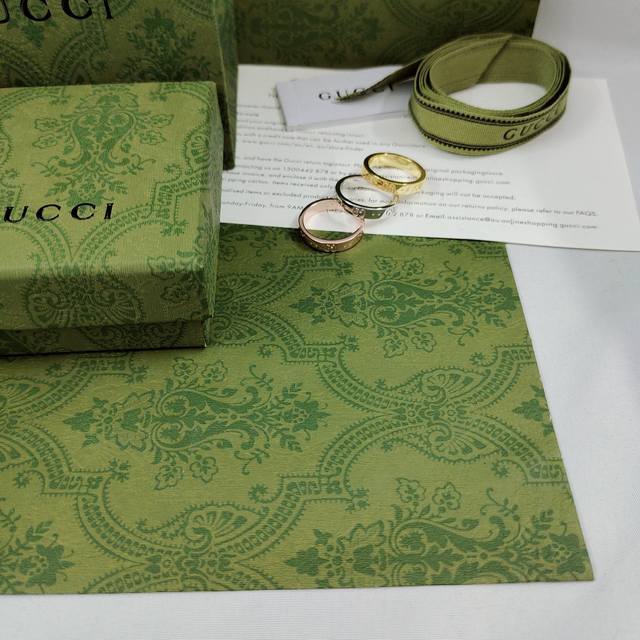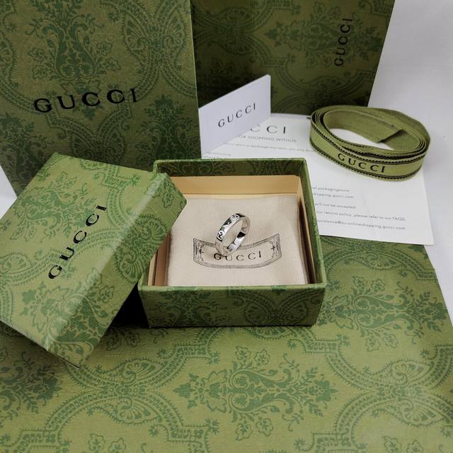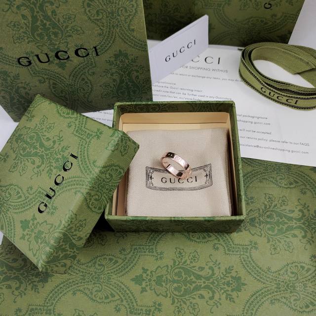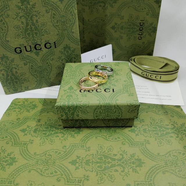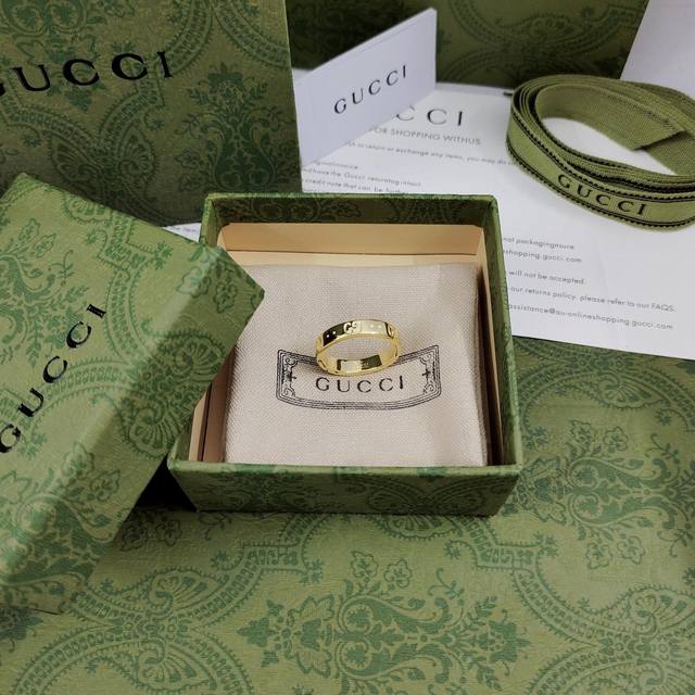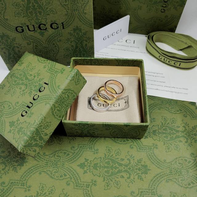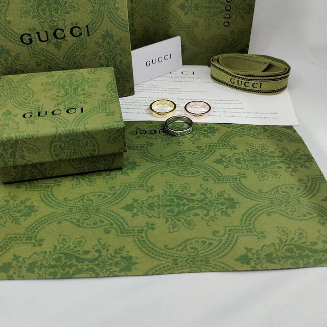 / Gucci这款戒指巧妙融入品牌双G字母交织图案 将Logo字母作为图案刻在饰品窄环上 全新系列廷续了经典标识 Gg图案三色 尺寸:6一11