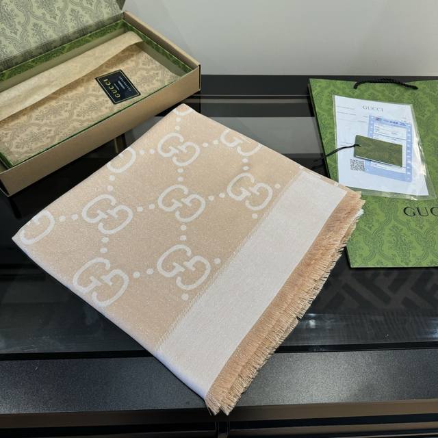 金属提花披肩 135*135Cm.32%粘胶纤维.25%绵.24%羊毛.11%桑蚕丝.8%金属化纤维 2025早秋软配饰系列运用精致流苏滚边、标识贴饰和精巧刺绣,为品牌元素注入新鲜活力。这款披肩以品牌创始人Guccio Gucci的姓名首字母,以Gg羊毛桑蚕丝混纺提花面料匠心打造,白色和银色制造,搭配的流苏滚边更添魅力。建议专业干洗。
