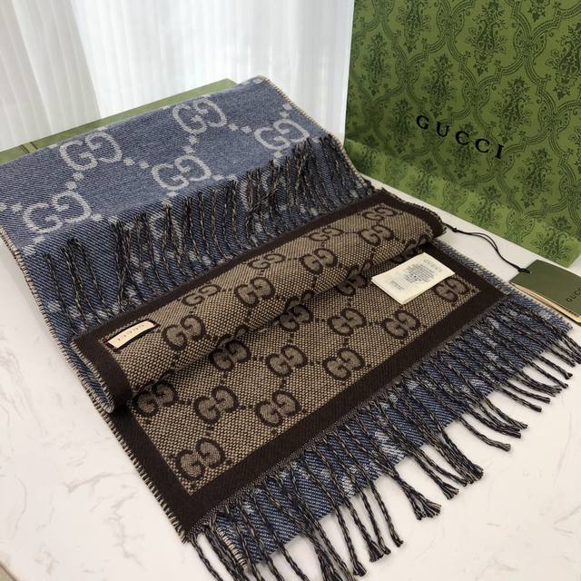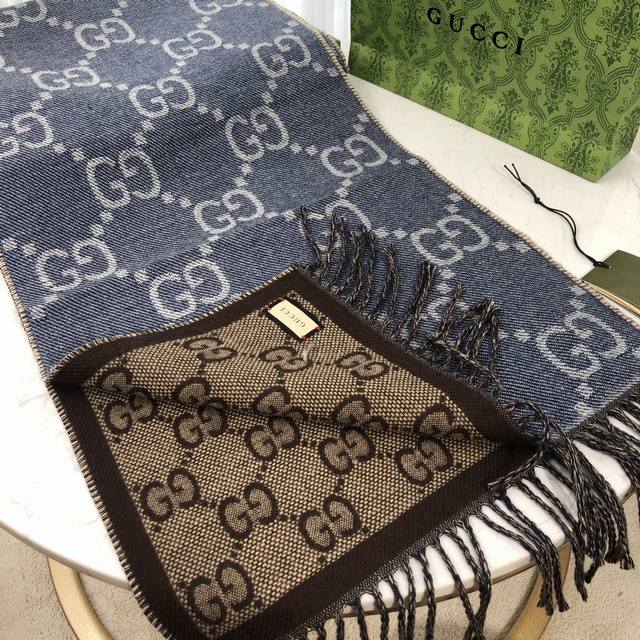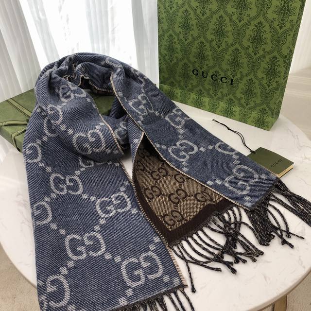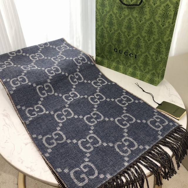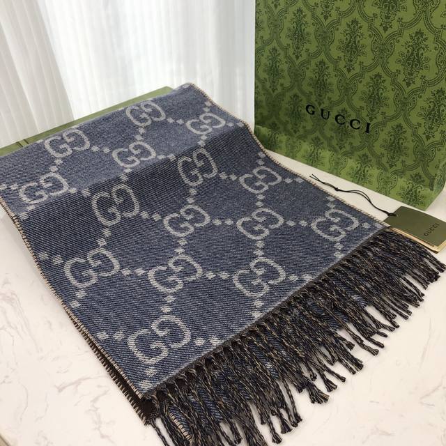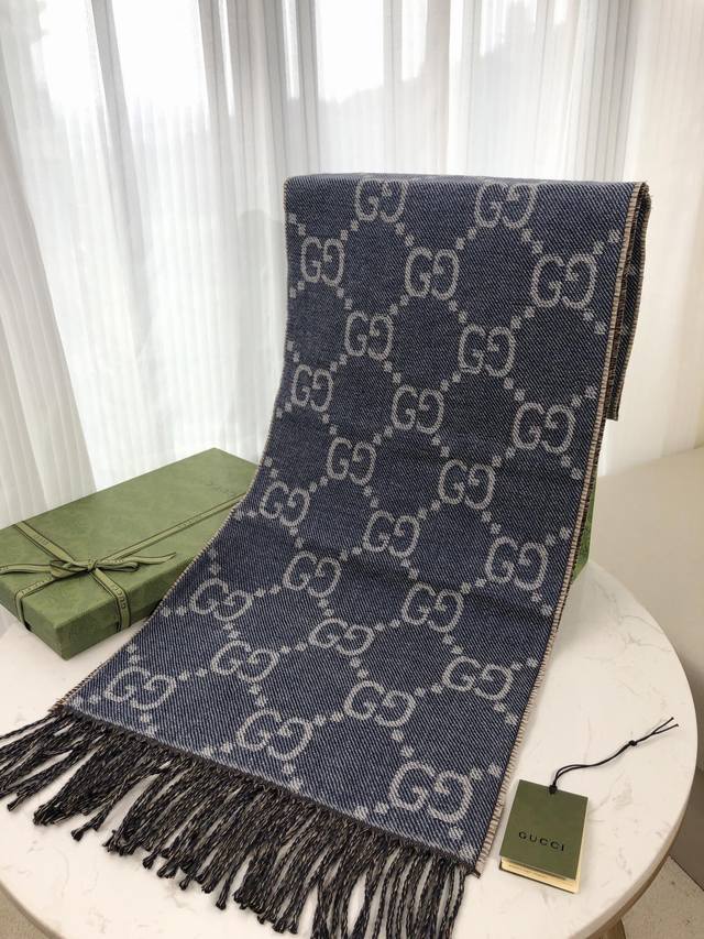 Gucci的姓名首字母演化而成。围巾采用深浅不一的灰色配色,饰以雅致的黑色流苏。