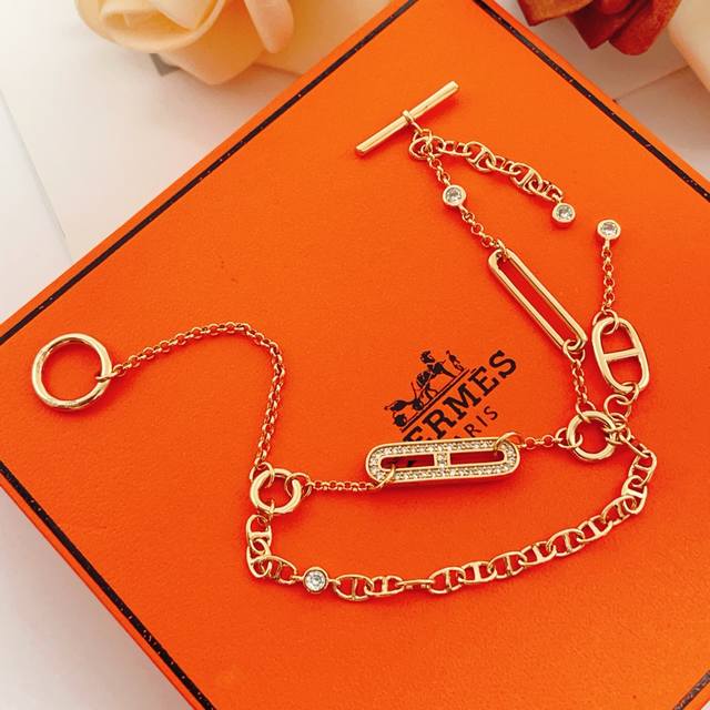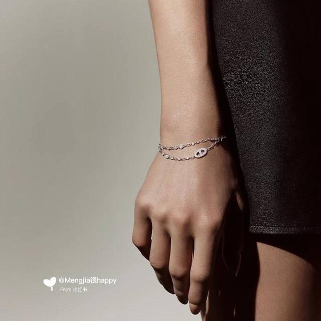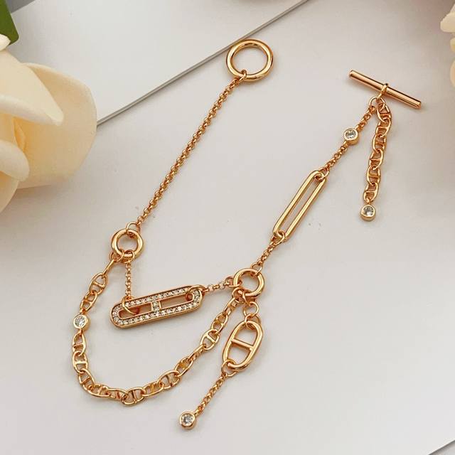 爱马仕He Mes最新款玫瑰金色双层流苏猪鼻子镶钻手链 一致Zp黄铜材质,非常的上镜设计很特别值得入手高级手工坊系列 DDD