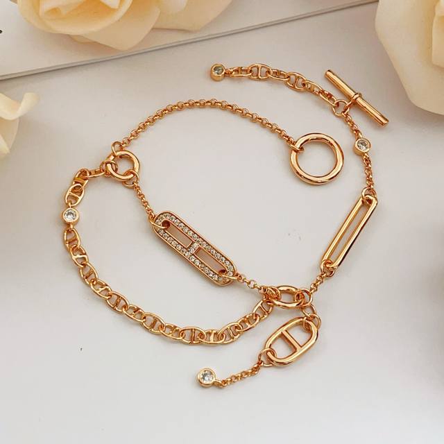 / 爱马仕He Mes最新款玫瑰金色双层流苏猪鼻子镶钻手链 一致Zp黄铜材质,非常的上镜设计很特别值得入手高级手工坊系列 DDD