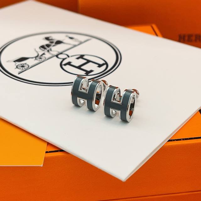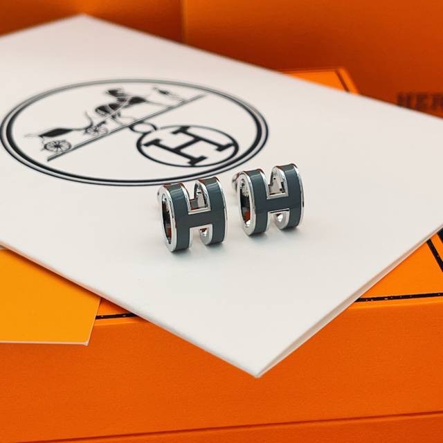 爱马仕He Mes最新款银边灰绿色H珐琅耳钉 一致Zp黄铜材质,非常的上镜设计很特别值得入手高级手工坊系列 DDD