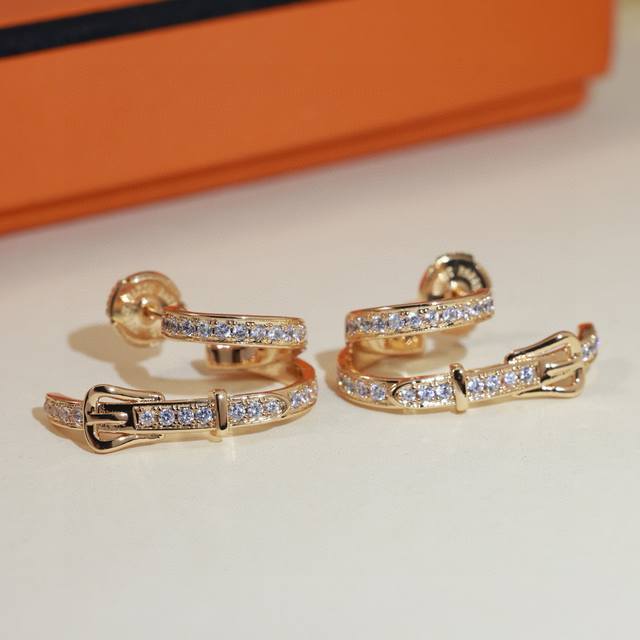 FFF 精工版本 Hermes 爱马仕皮带扣满钻耳钉 纯银耳针亚金材质 配飞碟耳塞。手工铲钉镶嵌5A锆钻!18K白金色!带Logo 爱马仕耳钉 皮带扣耳钉 DDD