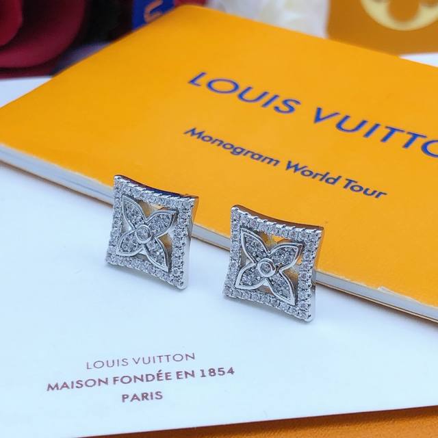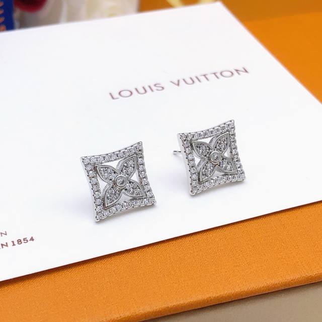 / 编号Led0034 Lv最新款老花耳钉银色镶钻菱形 一致Zp黄铜材质