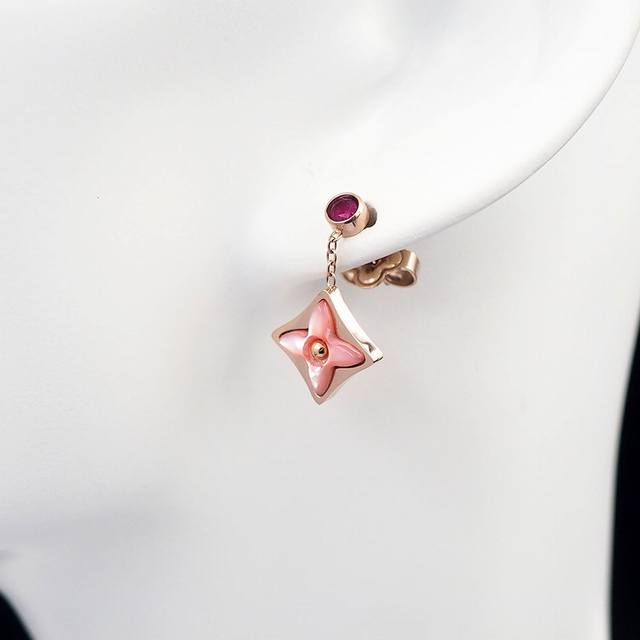 驴家Color Blossom Bb 耳钉推出情人节限量版设计,以华美格调点 亮各式场合。雕琢 Monogram 花卉,莹泽贝壳塑造圆 润花瓣,与红宝石共同呈现