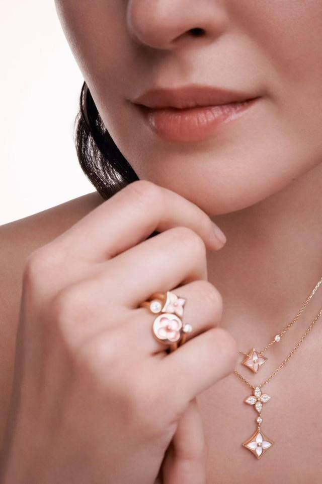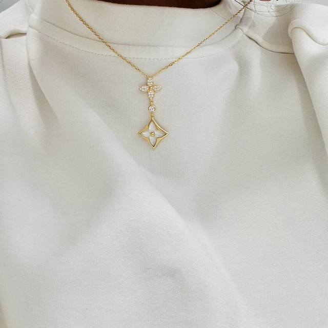 本款 Color Blossom Double Star 项链讴歌路易威登经典 Monogram 花卉的绽放。星形装饰闪耀密镶钻石的璀璨光芒,匠心雕琢的贝壳流露莹润柔泽。无论单独佩戴或与其他珠宝叠戴,均可释放温婉韵致。通体925纯银材质,厚金电镀,保色更持久