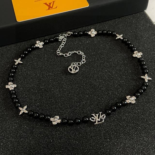 lu92 Lv路易威登时尚轻奢Lv字母吊坠镶彩钻圆钻两颗珍珠项链 黄铜材质 金银玫3色 重约10.9G 项链约长49Cm+5.5Cm+1.2Cm尾牌;Lv字母约