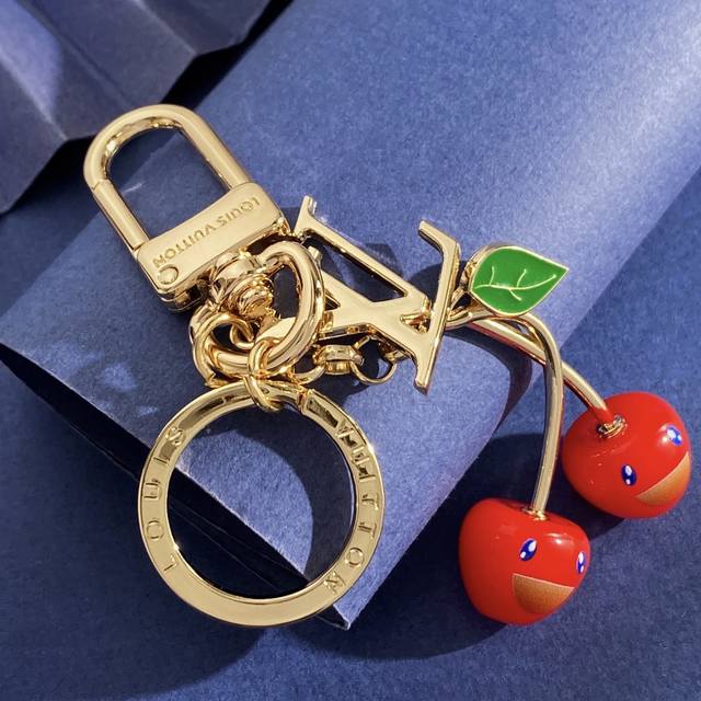 / lu92 Lv路易威登新款欧美风高级感潮流挂件光面Lv字母圆环绿叶子樱桃车厘子包包装饰品钥匙扣包饰 黄铜材质 重约30G 总高约10.8Cm