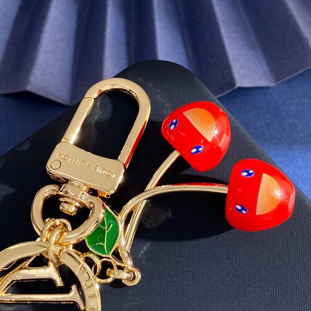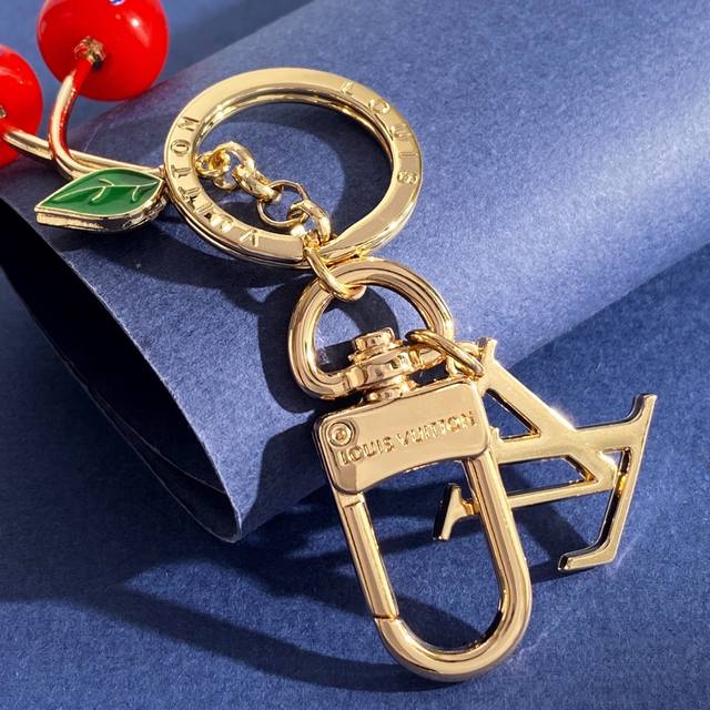 lu92 Lv路易威登新款欧美风高级感潮流挂件光面Lv字母圆环绿叶子樱桃车厘子包包装饰品钥匙扣包饰 黄铜材质 重约30G 总高约10.8Cm