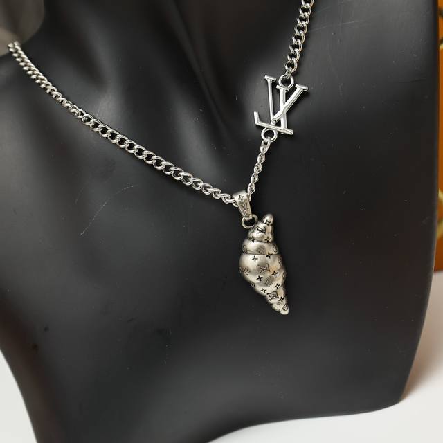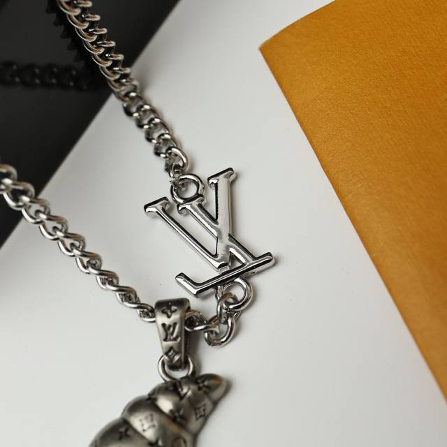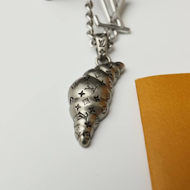 本款 Lvcroissant Medium 挂饰出自创意总监 pharrell Williams 之手,为法国文化与美食注入品牌姿彩。莹泽表面镂刻 Monogram 图案,可固定于项链的夹扣延续相同元素。海螺项链
