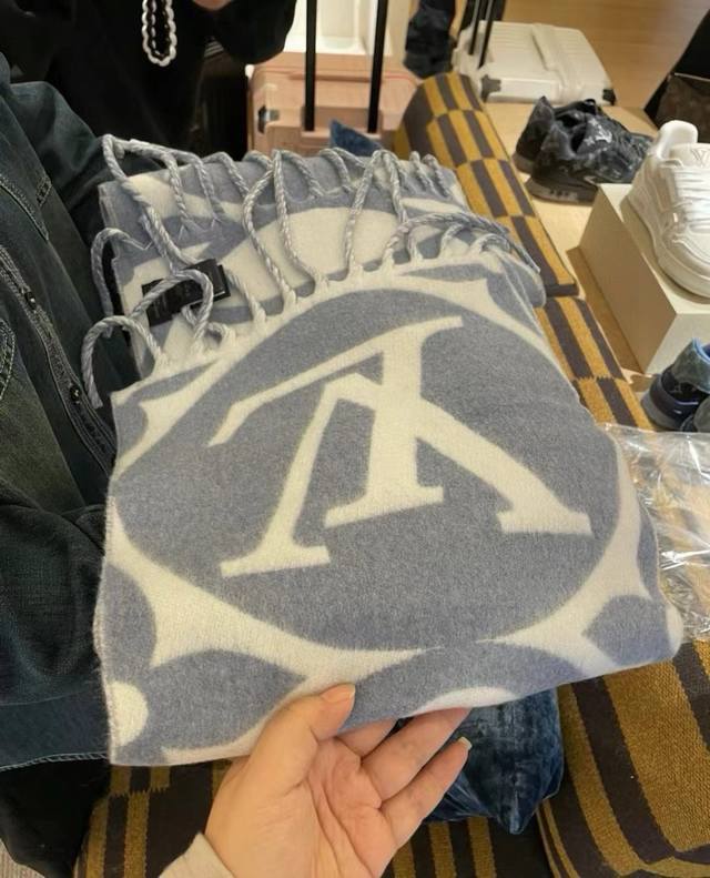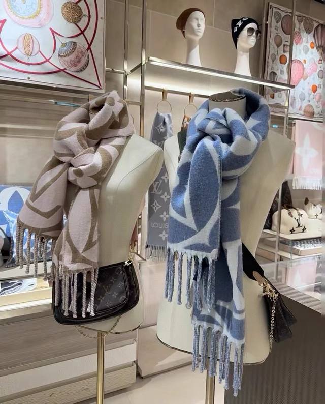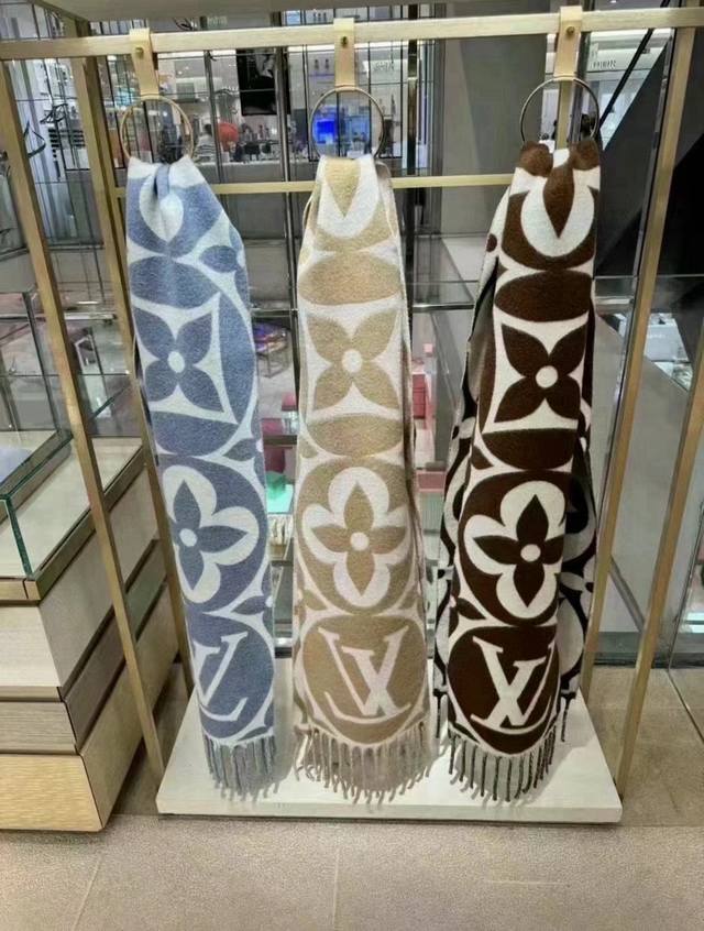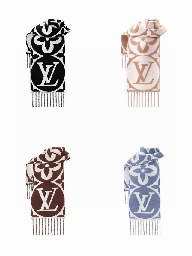 / 高版本 秋冬新款大驴家Medallion 围巾,以大号经典字母和 Monogram 花卉彰显品牌格调,再以纤长流苏饰边增添华美质感。绵羊毛围裹舒适暖意,无惧隆冬