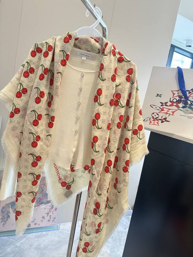 Lv × Tm Monogram Cerise 方巾出自路易威登X村上隆复刻系列,为华美丝毛点缀Monogram 图案,再以日本艺术家笔下的灵动樱桃元素注入清新活力。无论单独佩戴或搭配同系列其他单品,均可展露瞩目风采。140140