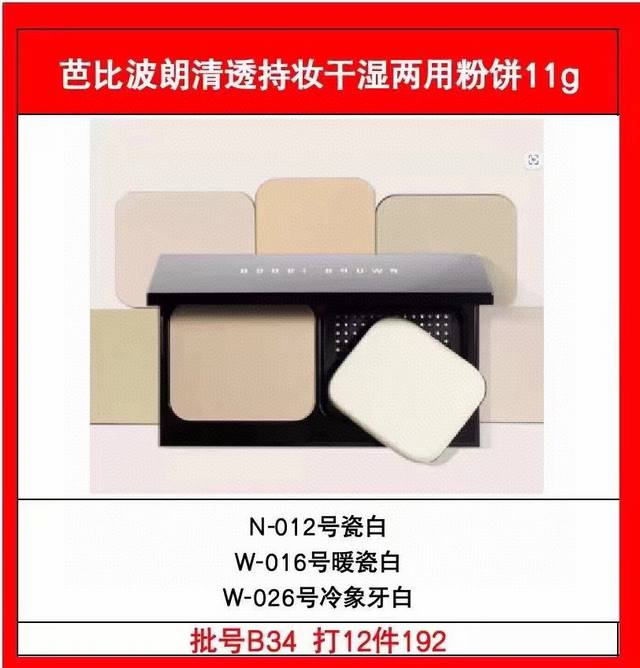 / 高品质 芭比布朗干湿两用粉饼11G。 B34编码!3色:N-012#瓷白,W-016#暖瓷白,W-026#冷象牙白。可配中文标