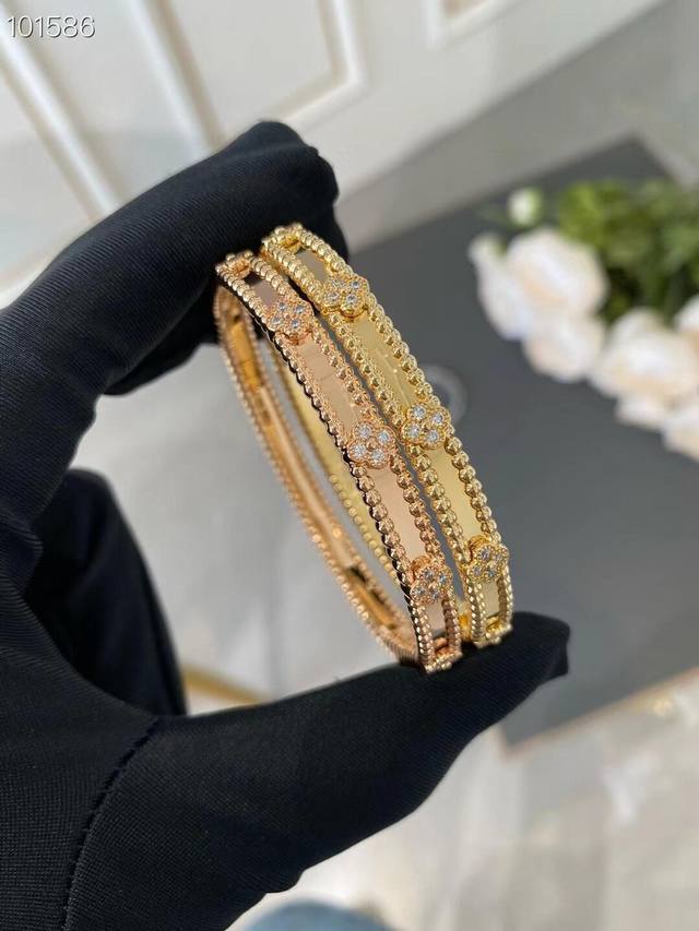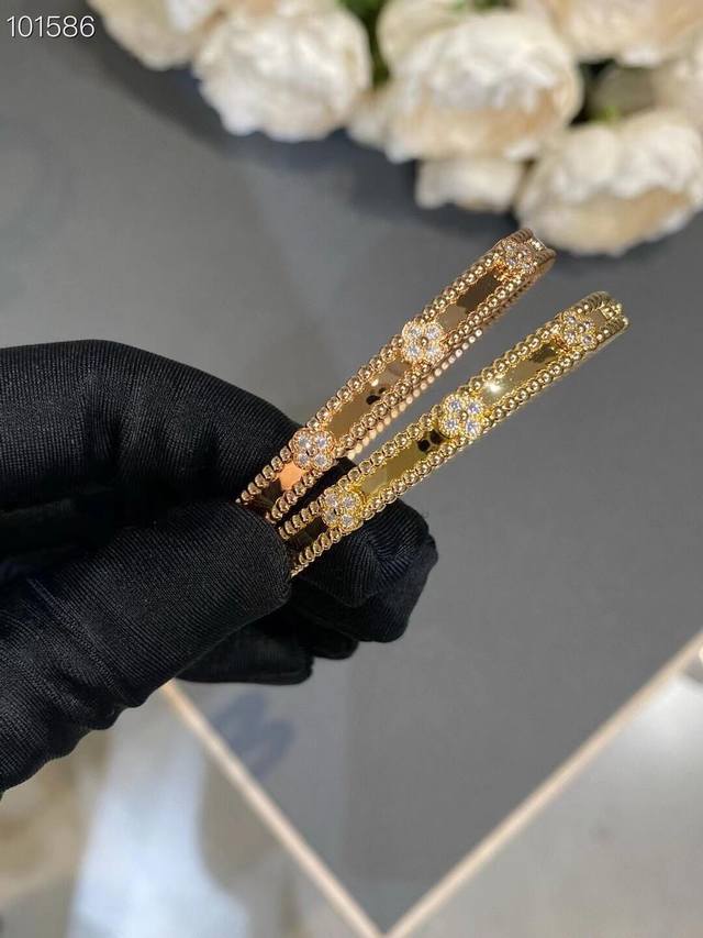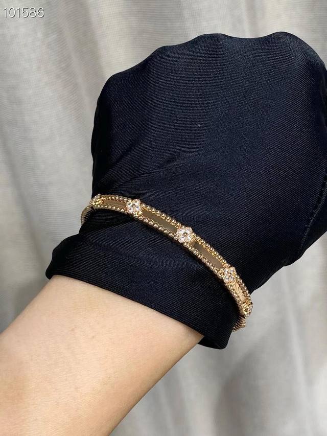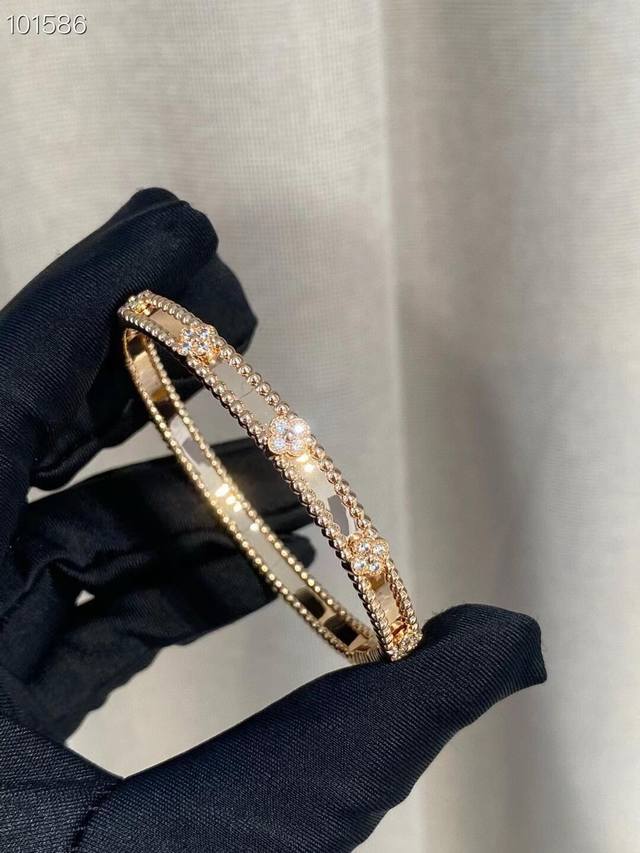 / V金材质梵克雅宝 Vca万花筒手镯 窄版 中间一排施华洛水晶镶嵌的四叶草有规律的呈现设计,璀璨闪耀! 经过镜面抛光 散发现代气息 可以单独或无限组合佩戴 简约却