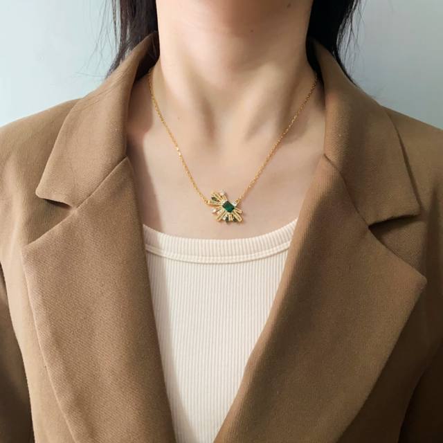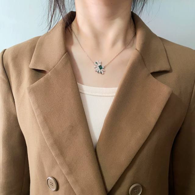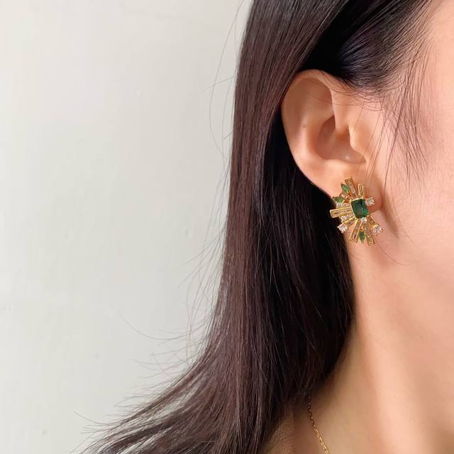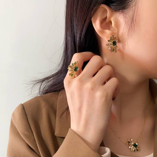 无标新款几何半边扇形耳饰时髦轻奢镶钻祖母绿微镶锆石耳钉项链开口戒指 黄铜材质 金银2色
