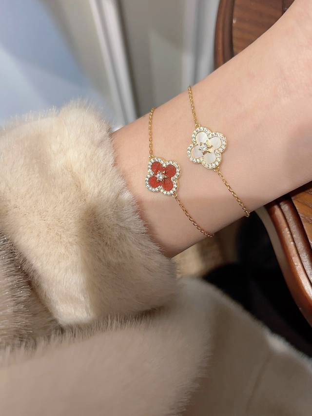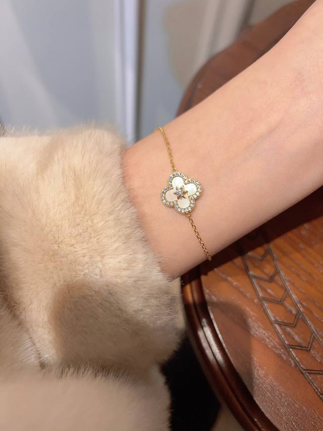 彩宝系列-六芒星四叶草手链 白色带来清透的气息,活力高级感拉满,通体925纯银行业标杆工艺独家行业标杆新技术电镀优金电镀,保色度做到目前市面最优!!独家配方!!里里外外都是925纯银的!!!主钻为128个切割面的对标真钻石的切割,真正的高定珠宝感工艺,看上边的排钻,从无边镶嵌到钻石切工的过渡,再到细节五金的塑造,费的工时真心不是一般工艺能比的,看过各种高定珠宝展的,都知道这种排钻法只有用在高定收藏级别的珠宝上,而我们把这种非常麻烦费工费时费钻的排钻工艺用在我们首饰上,为的就是