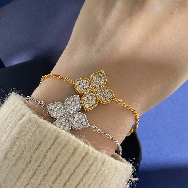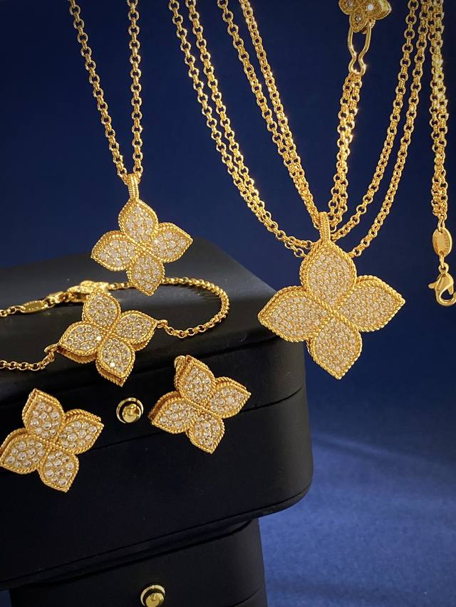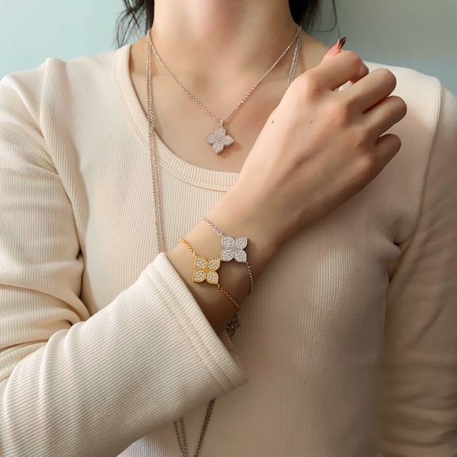 Roberto Coin珂瑛高级感时尚轻奢满钻菱形花几何花朵吊坠耳钉手链短项链长款项链毛衣链套装 黄铜材料电镀18K金 金色银色2色