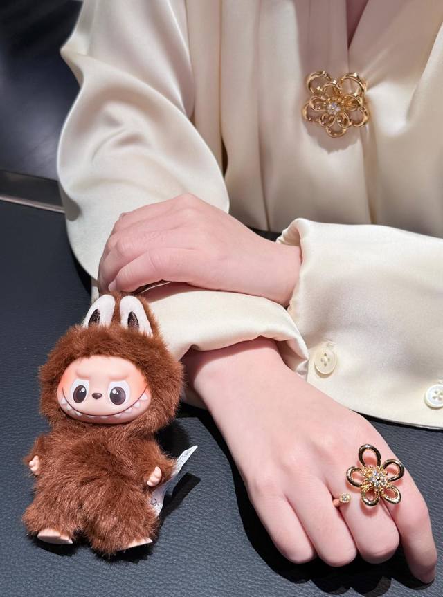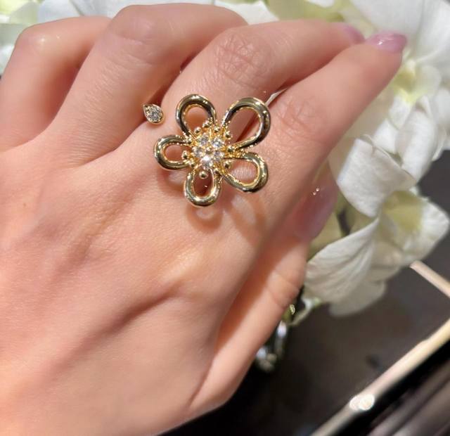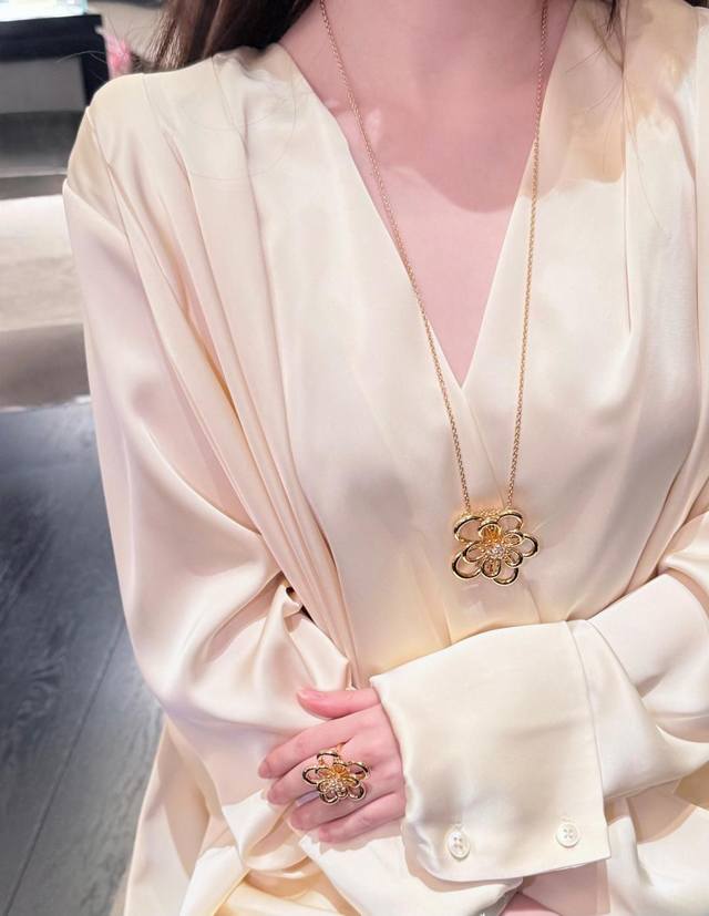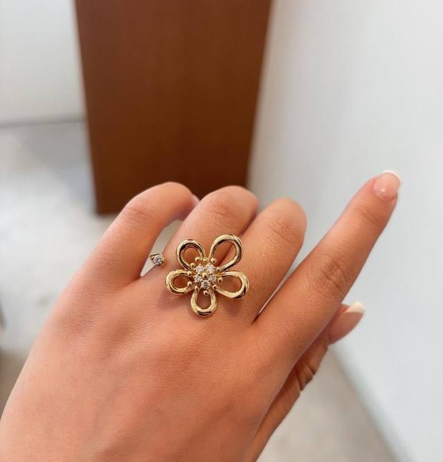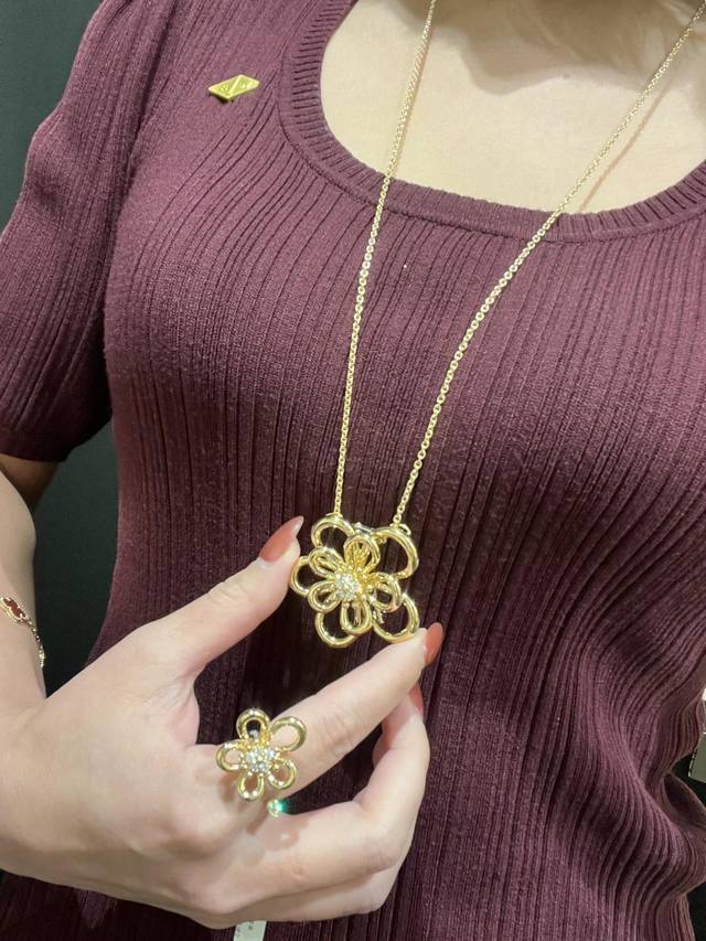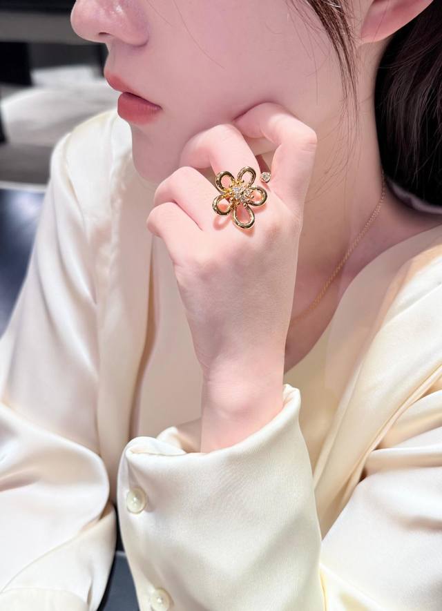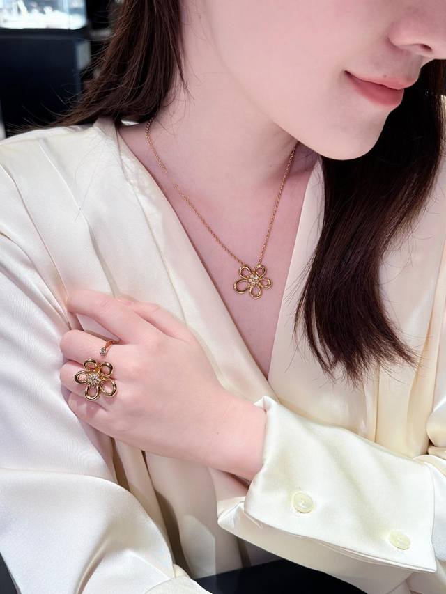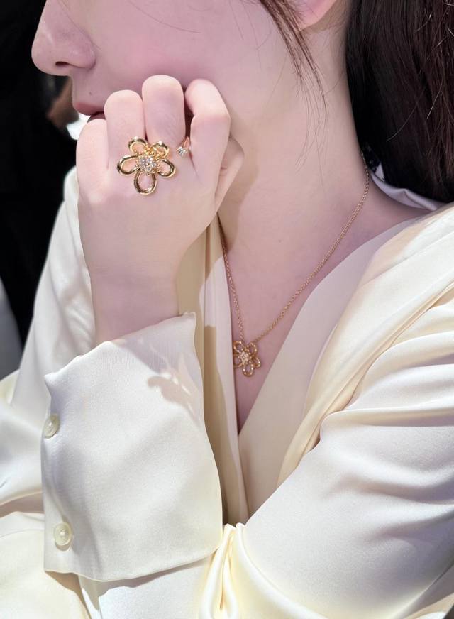新系列以灵动的黄金丝线勾勒出五瓣花朵 圆润的弧线不规则花瓣设计 同时诠释了纯真与俏皮的双重气质 抛光工艺让金色光泽如鎏金般闪耀
