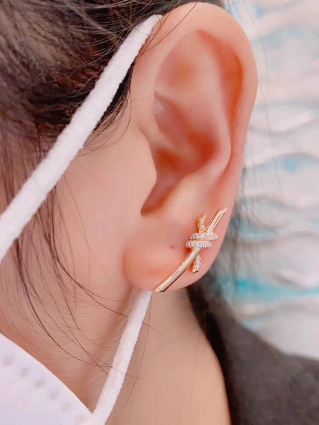 Knot耳环 很精致,也不会过细。工艺非常有讲究,弧度线条都是根据人体工程设计确保舒适度,手工镶嵌钻石,通体采用925银,电镀厚金,保色程度更久。