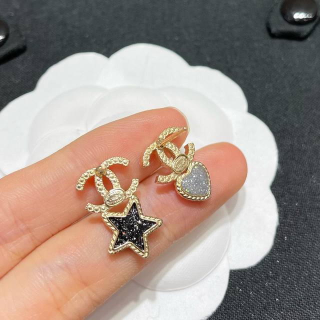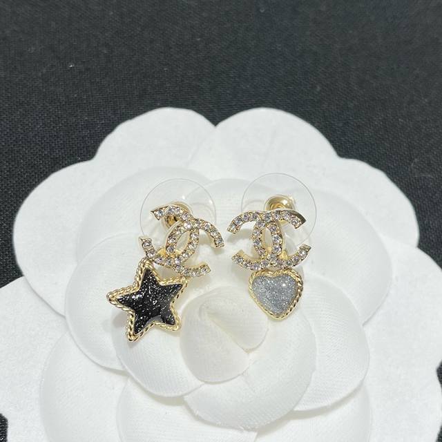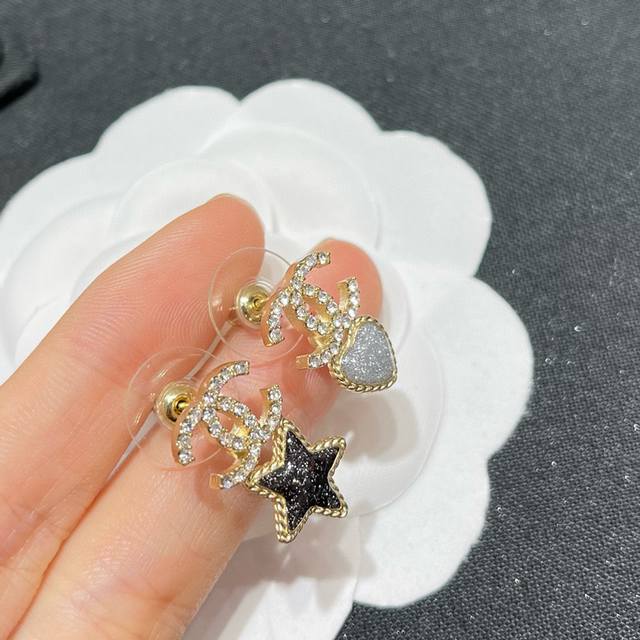 编号Xed0193 Ch*Nel 最新款星星爱心镶钻双C耳环 一致Zp材质 Ch Nel 新款星星心心鸳鸯小号耳钉超美超精致 集美们,推荐一款你们今年一定要入的