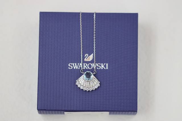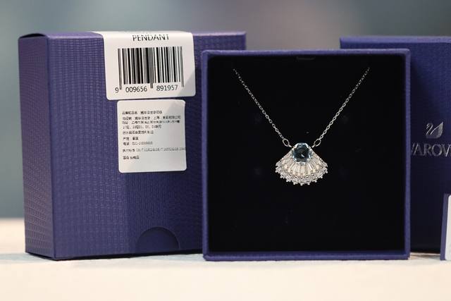 / 蓝钻水晶贝壳 锁骨项链 这款海洋风格的链坠是表达对海洋热爱的完美方式P优雅的链条采用镀铑设计,中央饰有贝壳图案,并点缀透明合成立方氧化锆,镶嵌一颗明亮的蓝色仿水